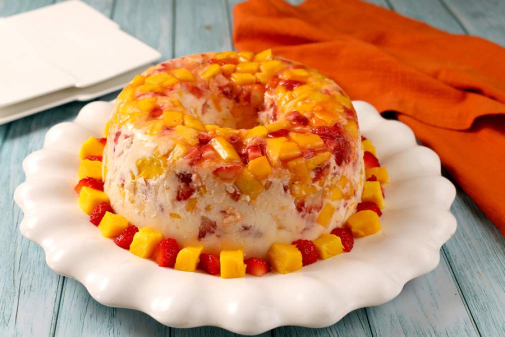 Misture as frutas em uma tigela. Coloque em uma forma de pudim média molhada. Dissolva a gelatina na água e leve ao fogo, em banho-maria até derreter bem. Ou no microondas por 1 minuto na potência alta. Bata no liquidificador com o creme de leite e o Sumo de Limão Castelo. Bata as claras em neve e adicione o açúcar aos poucos até ficar um suspiro firme. Despeje a mistura do liquidificador nas claras batidas e mexa até misturar bem. Despeje sobre as frutas, mexa delicadamente e leve à geladeira até firmar. Desenforme e sirva.
