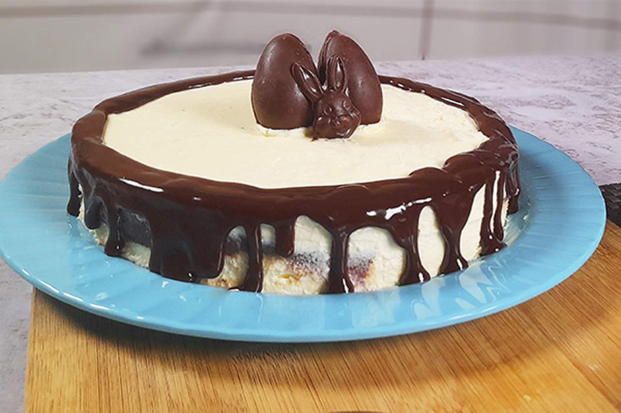 Montagem: Em uma forma de aro removível de 20cm, adicione a metade do creme. Em seguida acrescente a metade da ganache e cubra com o creme. Leve ao freezer por 3 horas. Desenforme e decore com a outra metade da ganache.