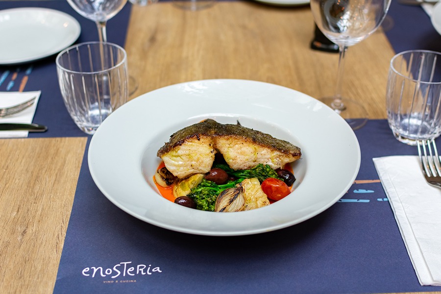 BACALHAU ASSADO, COUSCOUS GIGANTE, TAPENADE DE AZEITONAS PRETAS, EMULSÃO DE AZEITE E ERVAS FRESCAS
