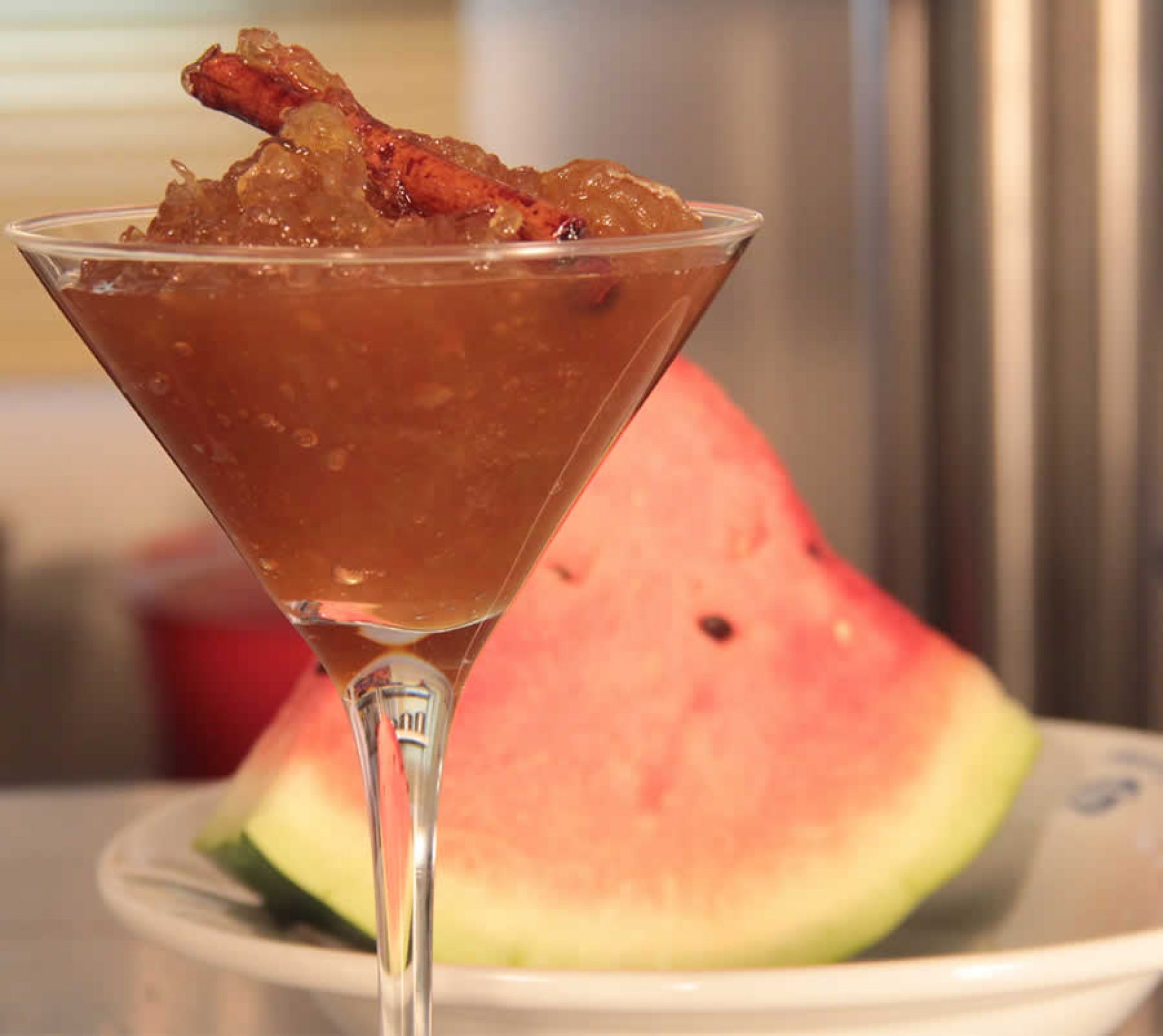 Coloque todos os ingredientes em uma panela e leve ao fogo médio até ficar transparente e secar o liquido que se desprenderá da casca da melancia. Sirva com queijo branco ou torradas.