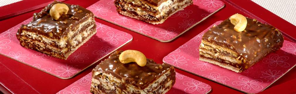 No momento de servir, corte o doce em quadradinhos, coloque-os em forminhas de papel. Decore-os com castanha-de-caju e sirva a seguir.
