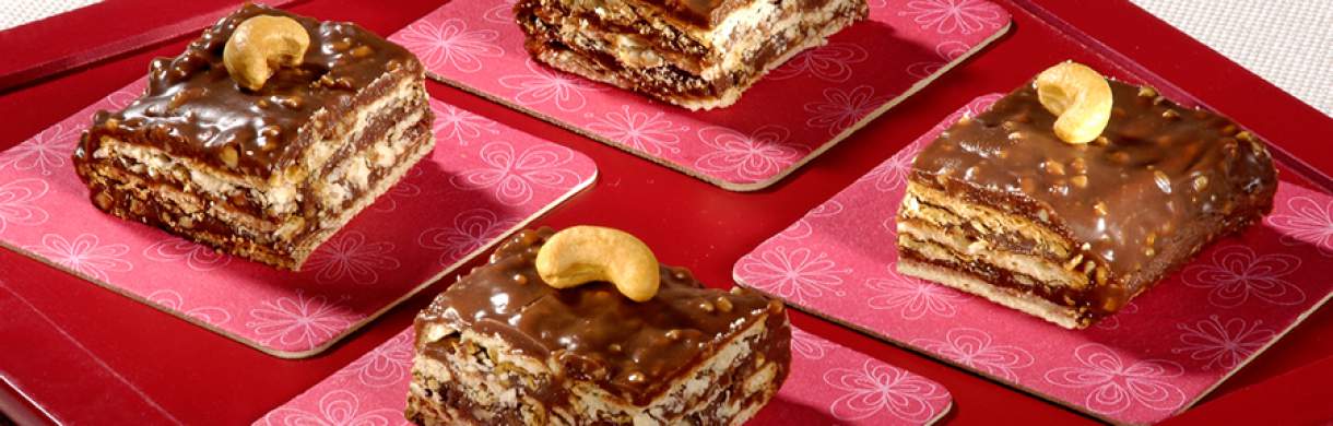 Forre o fundo e as laterais de um refratário retangular médio (35 x 20cm) com papel-alumínio. Monte alternando camadas de biscoito cream cracker e creme de chocolate com castanha-de-caju. São ao todo 5 camadas de biscoito e 5 de creme de chocolate e castanha-de-caju. Termine com creme de chocolate, castanha-de-caju e deixe descansar por 1 hora.