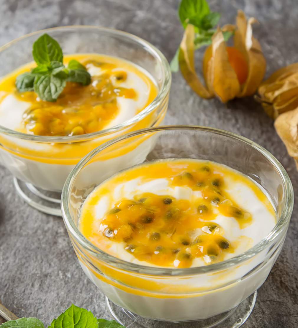 Mousse irresistível, a combinação perfeita do leite desnatado Xandô, abacaxi e maracujá.
