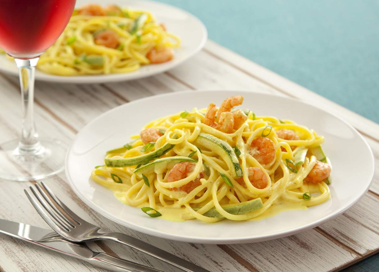 Escorra imediatamente, misture delicadamente ao molho aquecido para que toda a massa fique envolvida e junte os camarões e a abobrinha;