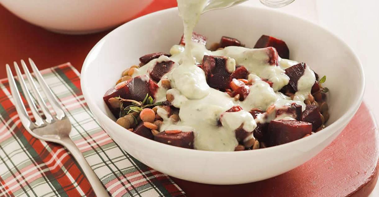 Lentilhas cozidas com beterraba assada e creme de Queijo Azul