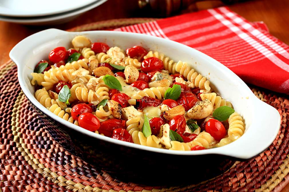 Em um refratário, distribua os tomatinhos. Regue com o Azeite de Oliva Castelo, o Vinagre Balsâmico Tradizionale Castelo e o sal e misture bem. No centro coloque o cream cheese e o queijo gorgonzola em pedaços. Enfeite com o manjericão e distribua os dentes de alho. Leve ao forno médio (200℃), pré-aquecido por cerca de 20 minutos. Retire, misture o macarrão cozido e mexa delicadamente, sem misturar muito. Sirva logo.