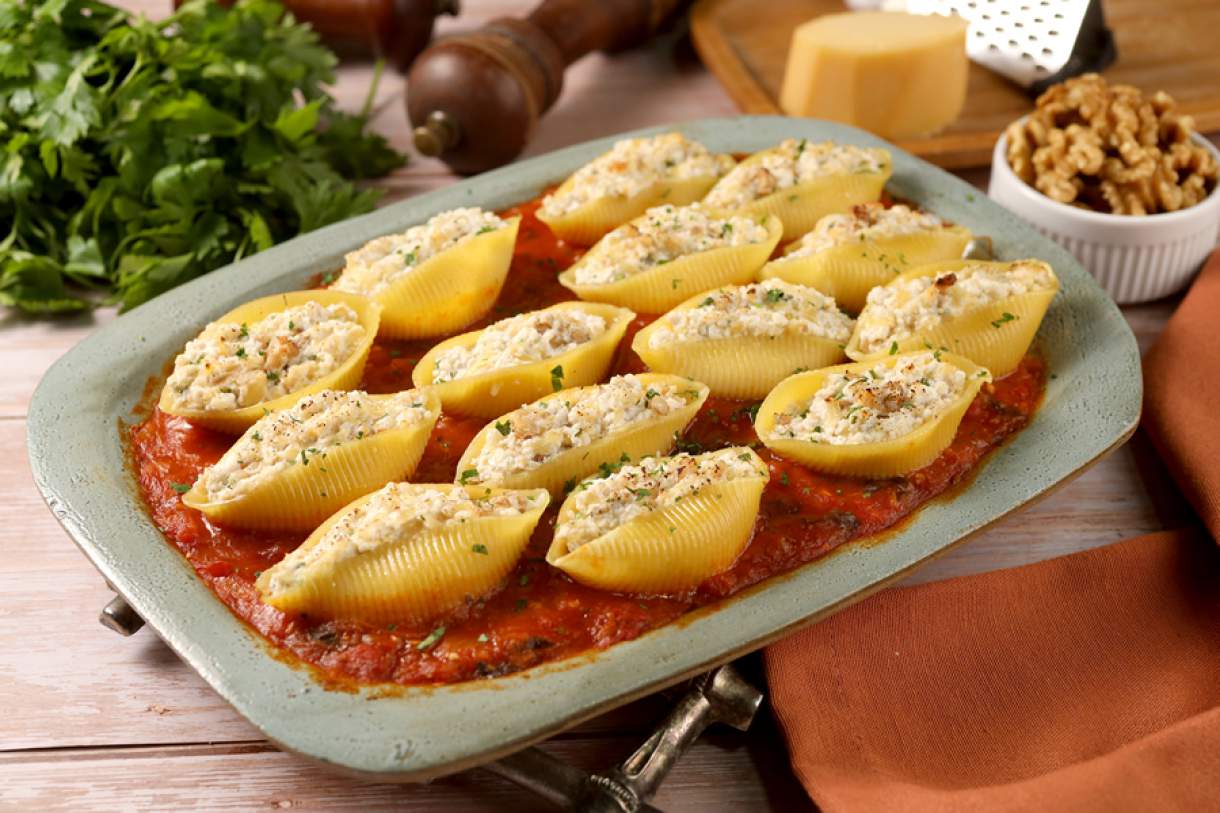 Coloque um caldeirão com capacidade para 3 litros de água para ferver. Quando ferver, adicione 1 fio de azeite e as conchas. Cozinhe sem deixar amolecer demais. Escorra e espere amornar. Bata a ricota, o queijo provolone e o Molho para Salada Parmesão Castelo em um processador e deixe até ficar uma pasta. Misture as nozes picadas e a salsa. Coloque em um saco plástico próprio para culinária, corte a ponta e recheie as conchas, espremendo o recheio dentro delas.