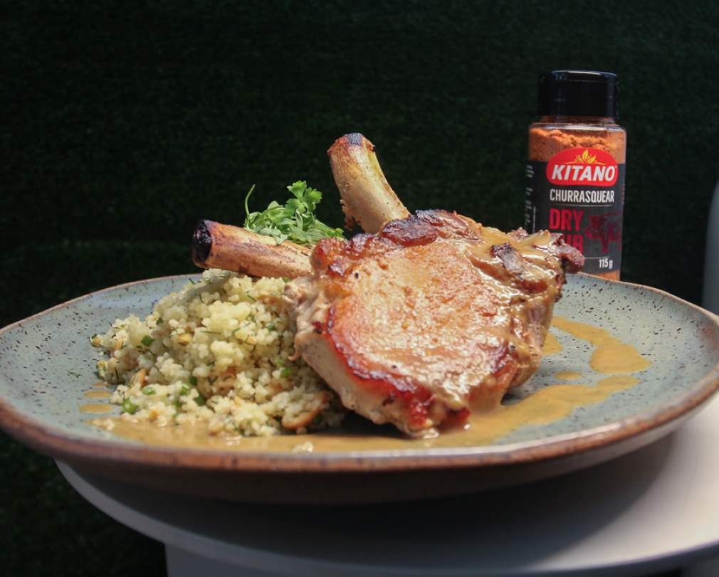 Carré de leitão com páprica defumada Kitano Reserva e cuscuz marroquino natalino com pimenta preta Kitano e Dry Rub Suíno Churrasquear