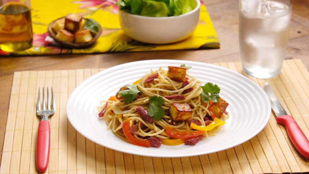 O macarrão de carne de sol é feito com Macarrão Galo Sêmola tipo Espaguete 8, carne de sol, queijo coalho e coentro, uma combinação que oferece uma mistura de sabores fortes e marcantes.