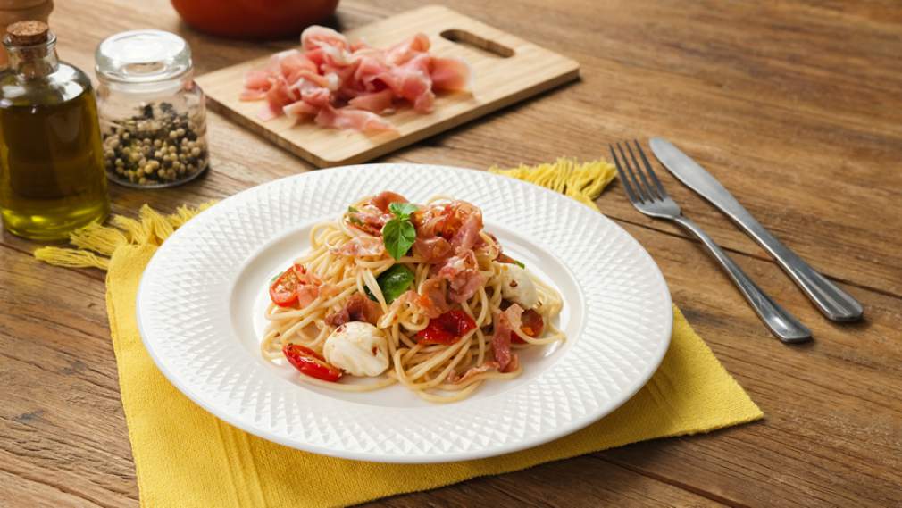 Com presunto de parma, tomates-cerejas e mussarela de búfala, essa receita de macarrão é saborosa e simples de ser preparada. Feita com o Macarrão Galo Sêmola tipo Espaguete garante toda a qualidade da sua refeição