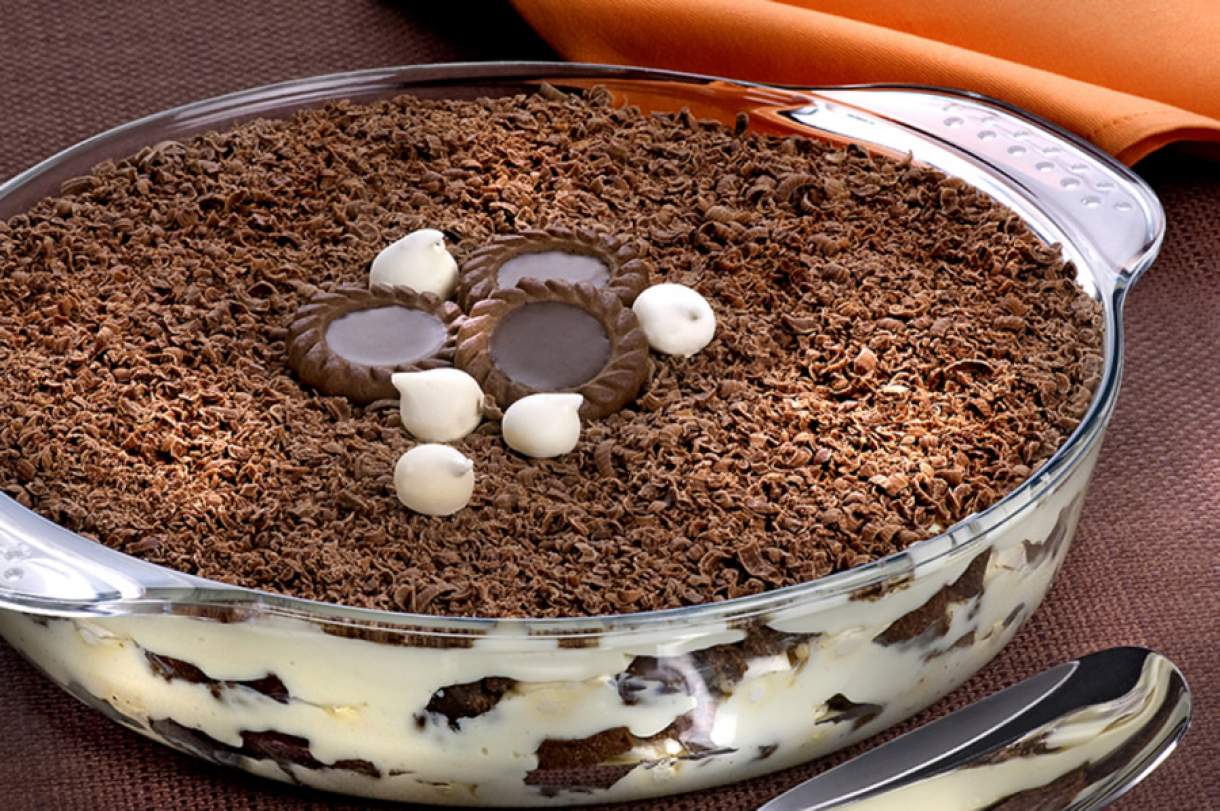 - Monte o merengue de chocolate num refratário pequeno da seguinte forma: creme, biscoito picado grosseiramente com suspiro, creme, biscoito picado grosseiramente com suspiro, creme, espalhe por cima chocolate ao leite ralado e decore com biscoito e suspiro.