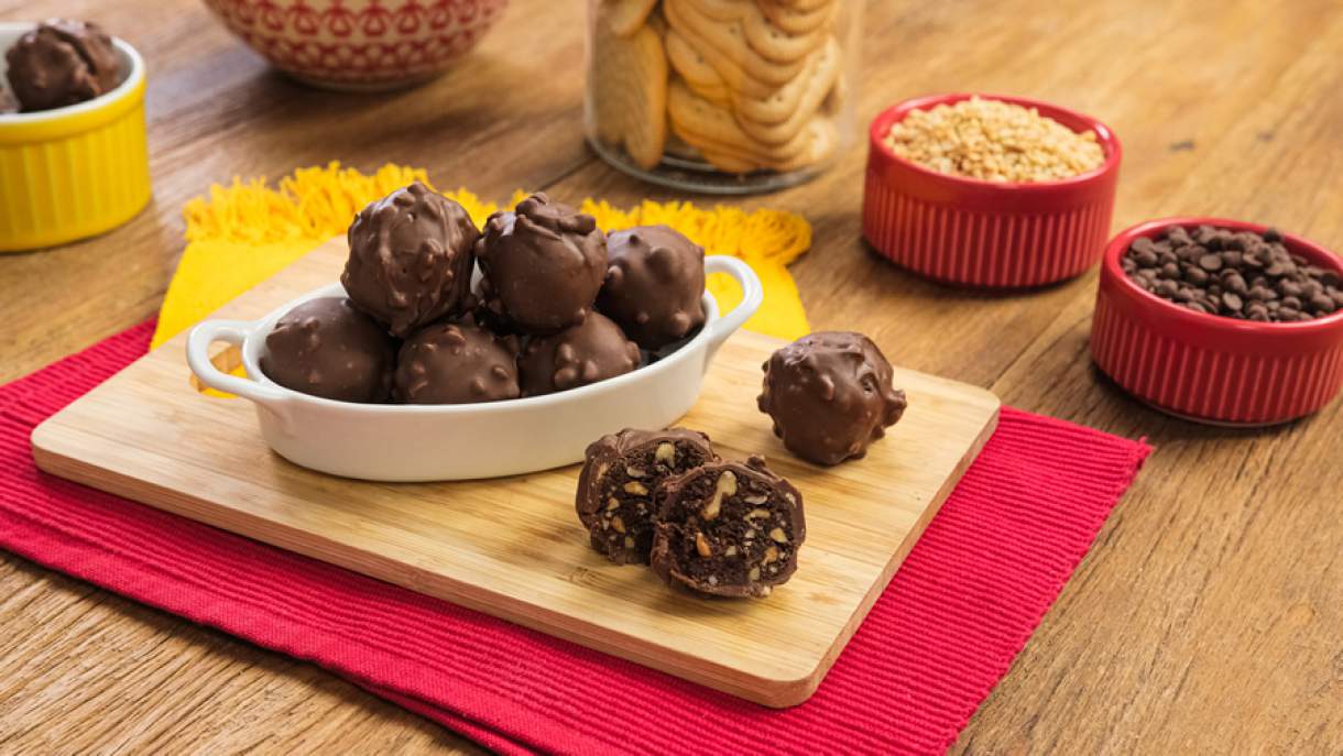 1. Triture os biscoitos com o amendoim. Misture o chocolate em pó e o creme de avelã até formar uma massa firme e faça bolinhas.