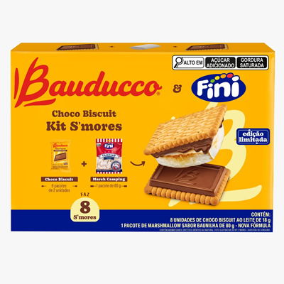 Além disso, para facilitar ainda mais o preparo da receita, a Bauducco em parceria com a Fini, oferece um kit especial para a preparação do S'mores, em edição limitada. O Bauducco®️ Choco Biscuit & Fini Kit S’mores é composto pelo Bauducco Choco Biscuit (biscoito que já vem coberto com o chocolate) e um pacote de Marshmallow Camping da Fini, todos os ingredientes necessários para o preparo da receita.