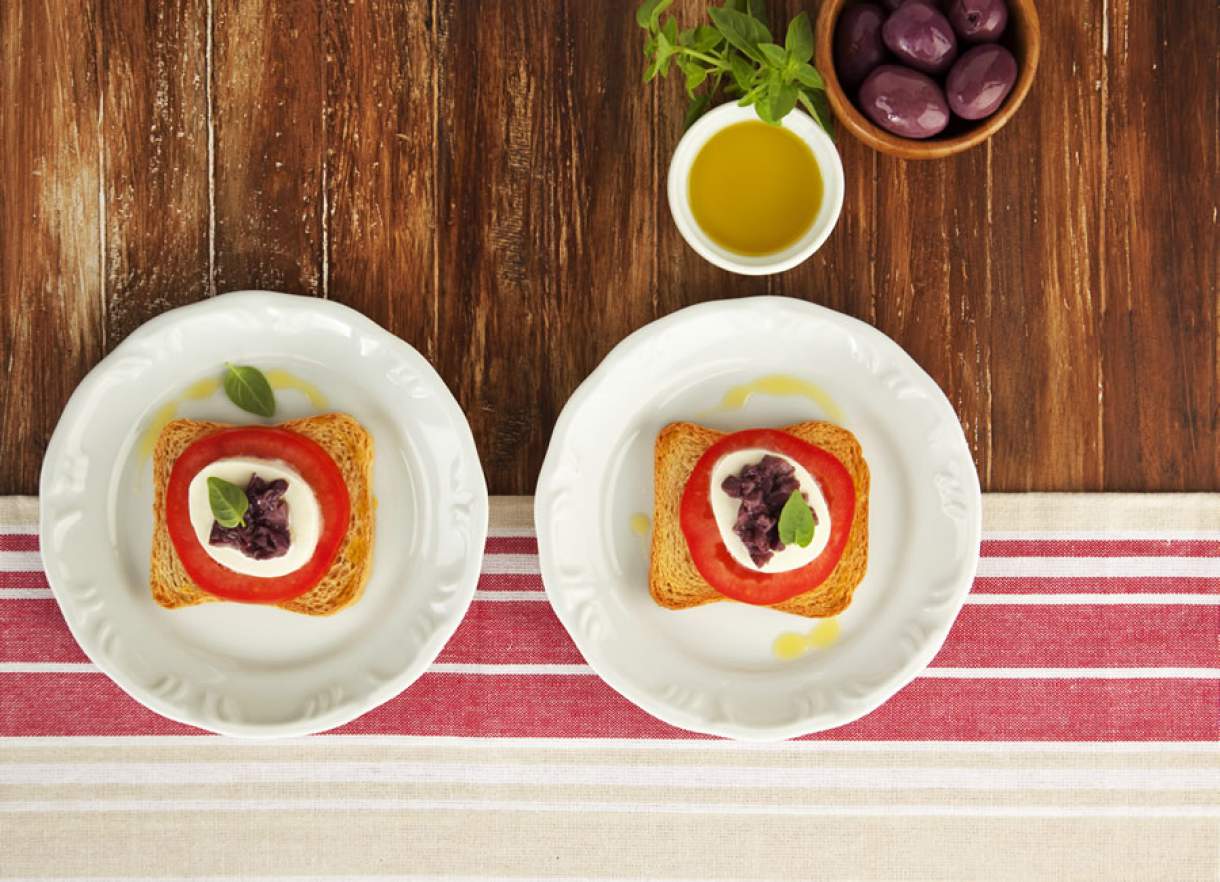 - Sobre cada torrada acomode uma fatia de tomate e, por cima, uma fatia de mussarela de búfala. Decore com a pasta de azeitonas e o manjericão.
