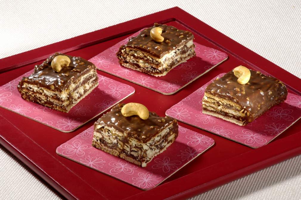 - São ao todo 5 camadas de biscoito e 5 de creme de chocolate e castanha de caju.