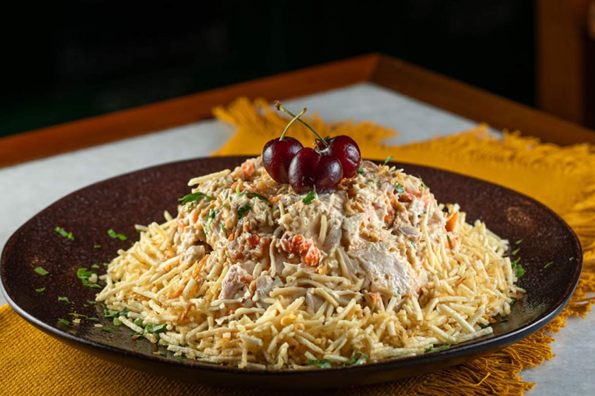 Salpicão de pernil com maça verde zeste de limão siciliano e mandioquinha palha