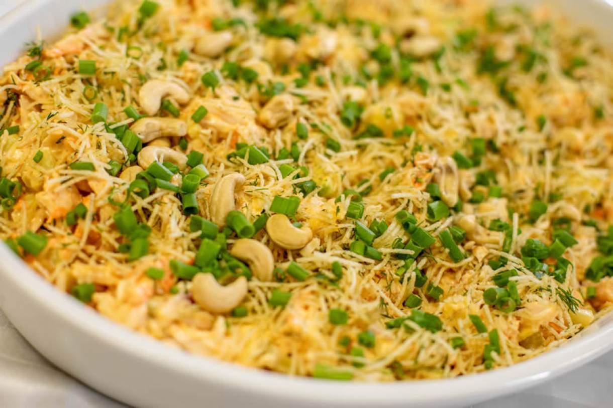 Em um bowl, misture delicadamente o frango defumado desfiado com a uva passa (sem o vinho), as maçãs (sem o suco de limão), o abacaxi, o salsão, a cenoura, a azeitona, a cebolinha, metade do endro dill, o curry em pó, metade das castanhas de caju, a maionese e o iogurte. Ajustar a pimenta e o sal e levar à geladeira por duas horas. Na hora de servir, colocar em uma travessa e salpicar com uma “farofinha” de batata palha, endro dill e castanha de caju.