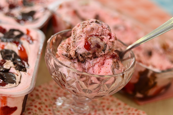 o Despeje o sorvete e, por cima, acrescente mais geleia e ganache.