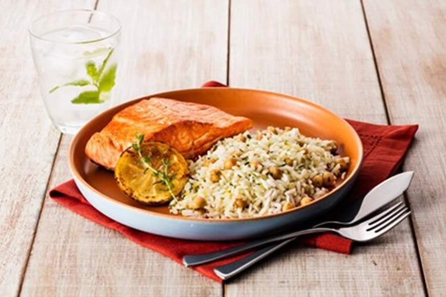 Para o arroz, em uma panela, prepare o Arroz Tio João Grãos Nobres com a água, de acordo com o modo descrito na embalagem, e reserve. Em uma frigideira funda, aqueça o Azeite Nova Oliva e refogue cebola e alho. Coloque o grão-de-bico e misture, tempere com o sal e a pimenta-do-reino. Adicione o suco de limão e as raspas de limão-siciliano. Desligue o fogo e, na mesma frigideira, misture delicadamente o arroz.