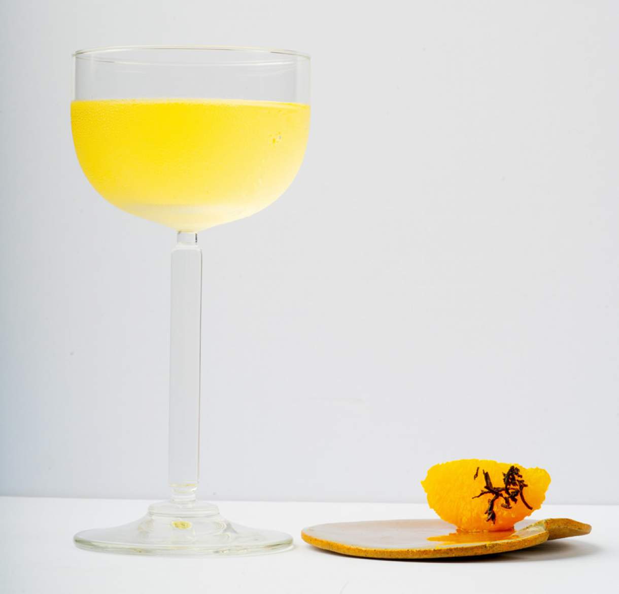 Coe duplamente o líquido do mixing glass para a taça e aromatize com os óleos de um zest de laranja.