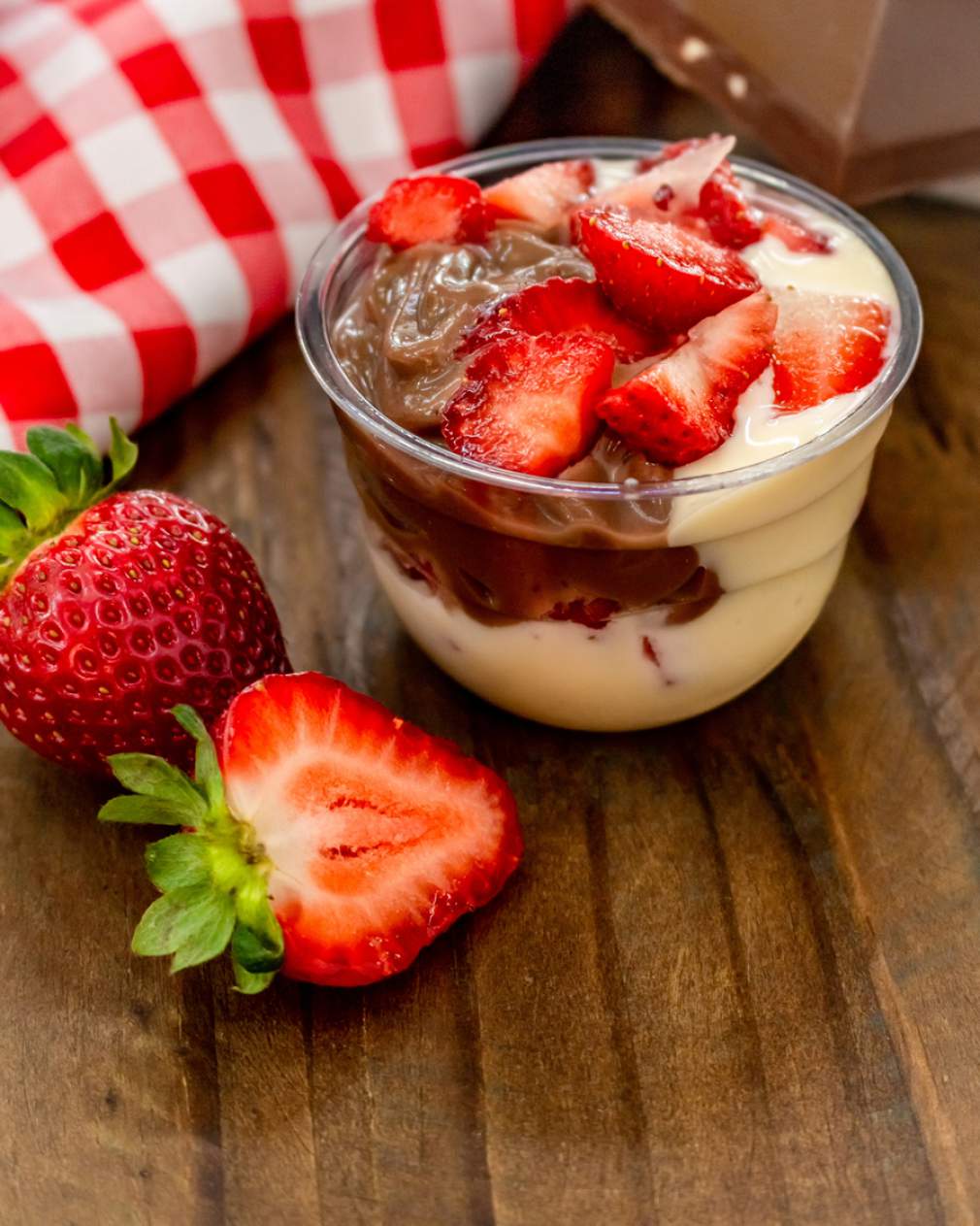Para um toque extra, decore com morangos frescos por cima e leve à geladeira por alguns minutos antes de servir.
