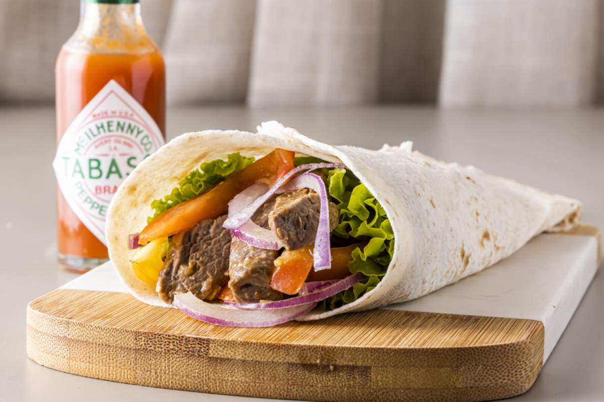 A combinação de tiras suculentas de filé-mignon com molho de iogurte temperado com alho, limão e a picância inconfundível do Molho TABASCO® Original transforma o tradicional kebab em uma explosão de sabores perfeita para a estação. A montagem leva pão folha, acelga crocante, cebola roxa e tomate, resultando em um lanche leve, prático e surpreendente.