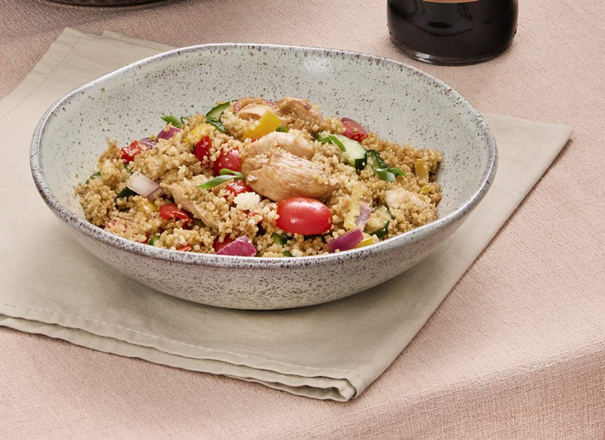 Coloque o cuscuz marroquino em uma tigela grande e tempere com sal e 1 colher de azeite. Quando a água ferver, hidrate o cuscuz e tampe com um pano. Reserve.