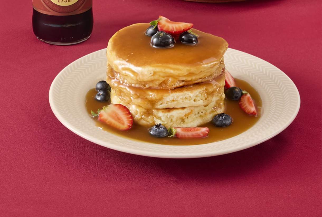 Além da calda, sirva as panquecas acompanhadas pelos morangos e mirtilo.