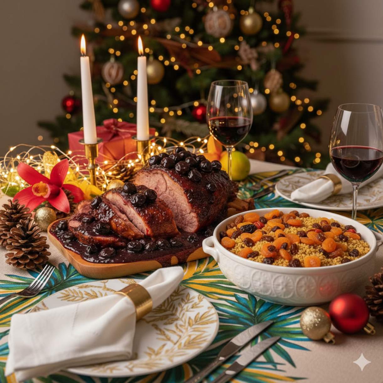 Combine alho, cebola, suco de laranja, vinagre, açúcar, vinho, sal e pimenta. Marine a carne de porco por 12 horas. Asse a 175 °C por 2 horas e meia a 3 horas, regando ocasionalmente com o próprio suco. Reduza o líquido da assadura com açúcar e vinagre até engrossar ligeiramente. Finalize com manteiga e, se desejar, vinho branco para deglaçar. Para a farofa, refogue a cebola na manteiga e no óleo, adicione a farinha de mandioca, toste levemente e incorpore as frutas secas. Fatie a carne de porco, regue com o molho e sirva com a farofa.