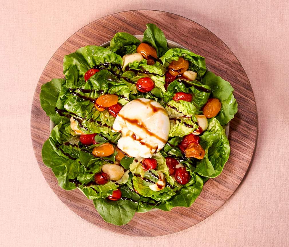 Em uma assadeira adicione os tomatinhos, a mussarela de búfala e a burrata, cubra com o azeite e o Shoyu e leve para assar por 15 minutos a 180⁰C.