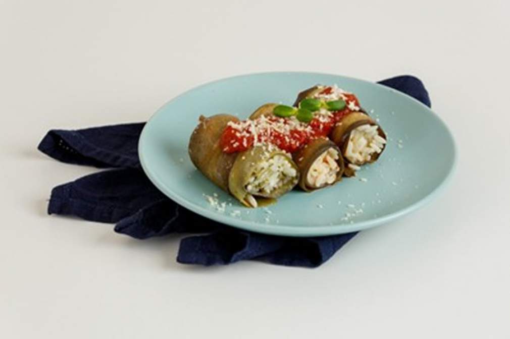 Prepare o conteúdo do pacote de Tio João Cozinha Fácil Arroz com Brócolis conforme as instruções da embalagem e reserve. Corte a berinjela em tiras bem finas. Em uma frigideira coloque um fio de Azeite Nova Oliva, deixe aquecer bem e grelhe as fatias de berinjela. Reserve. Coloque as tiras de berinjela sobre uma tábua de carne, recheie com uma colher do arroz a ponta de cada berinjela e faça rolinhos.
