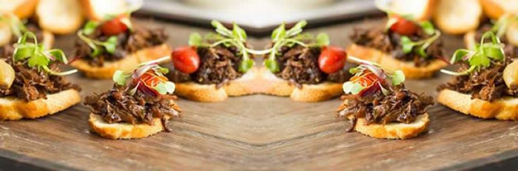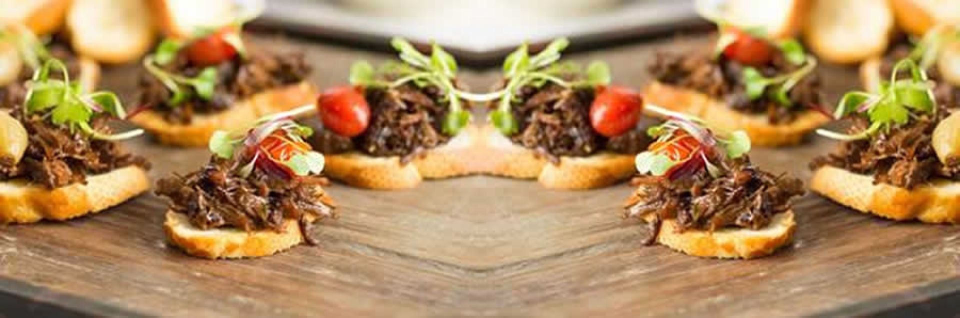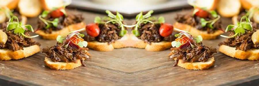 Bruschetta de acém com minicebolas, tomate-cereja e brotos de miniagrião