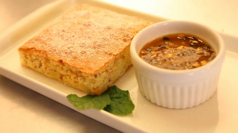 Brownie de chocolate branco com castanha de caju e calda de maracujá