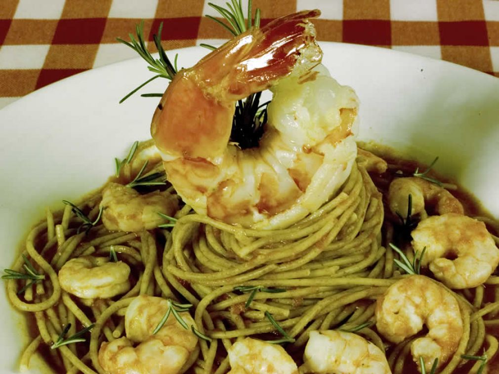 Em uma vasilha, tempere os camarões com o sal, pimenta, as ervas finas e reserve. Em seguida, cozinhe o macarrão conforme as instruções da embalagem.