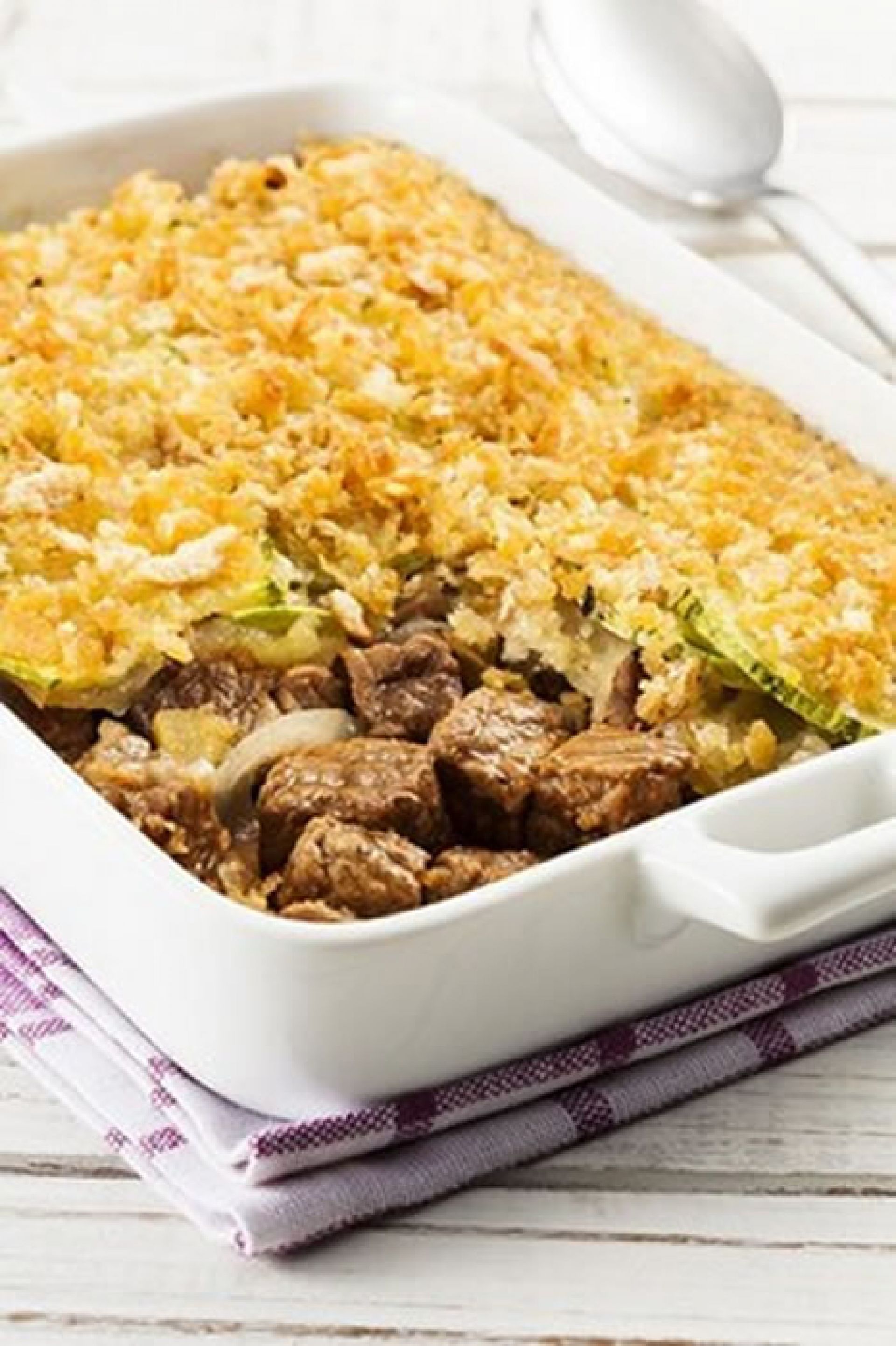 Em um refratário, coloque a carne e, por cima, acomode uma camada de maçã e abobrinha. Cubra com a farofa de pão e leve ao forno até dourar.