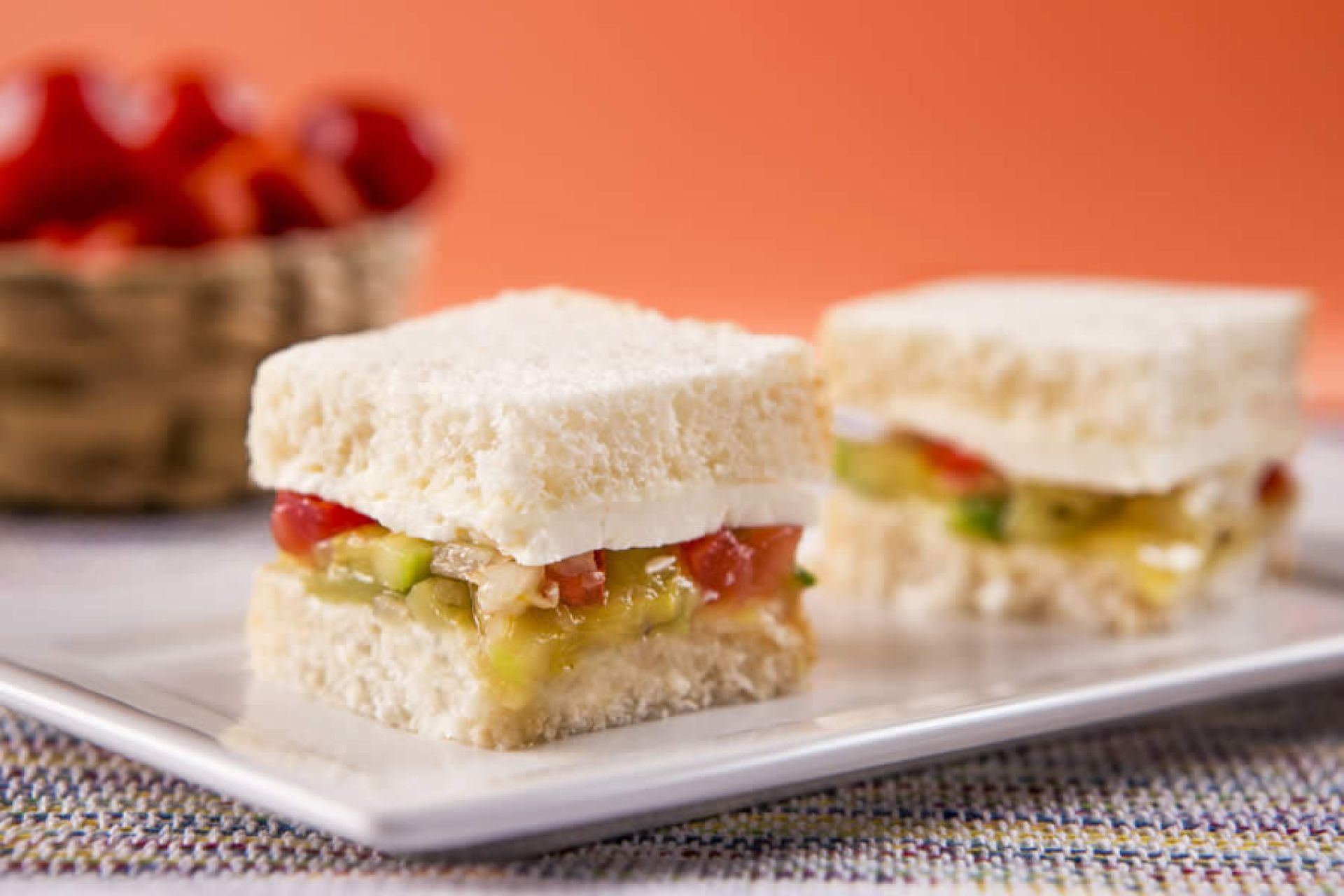 Reserve o pão e o queijo. Em uma panela, coloque o azeite e refogue a cebola. Em seguida, coloque a abobrinha, sal e a pimenta. Mexa bem, acrescente o tomate e refogue levemente. Coloque em uma peneira para escorrer e esfriar. Para montar o sanduíche, retire a casca do pão, coloque a abobrinha e uma fatia de queijo branco e conte em quatro.