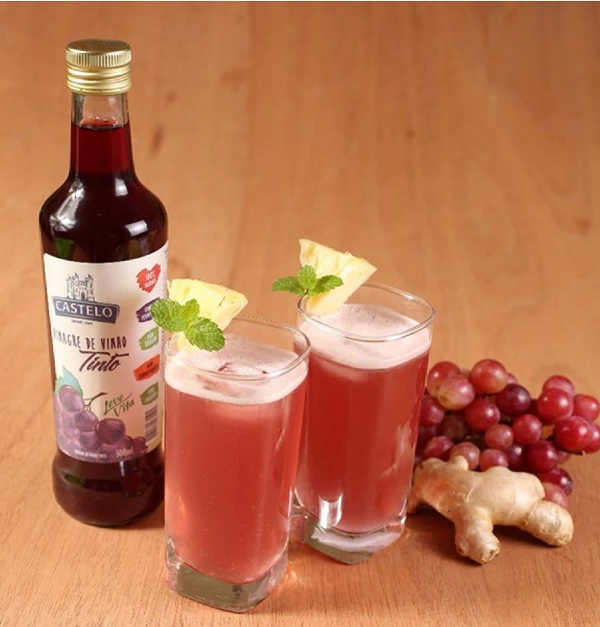Nada melhor do que um suco refrescante e com ingredientes saudáveis para se recuperar dos exageros das festas do fim do ano e curtir o verão revigorado. Esta receita da Cinthya Maggi, elaborada especialmente para Castelo Alimentos, contém abacaxi (que hidrata e ajuda a emagrecer) e os antioxidantes do Vinagre de Vinho Tinto 100% Natural Castelo.