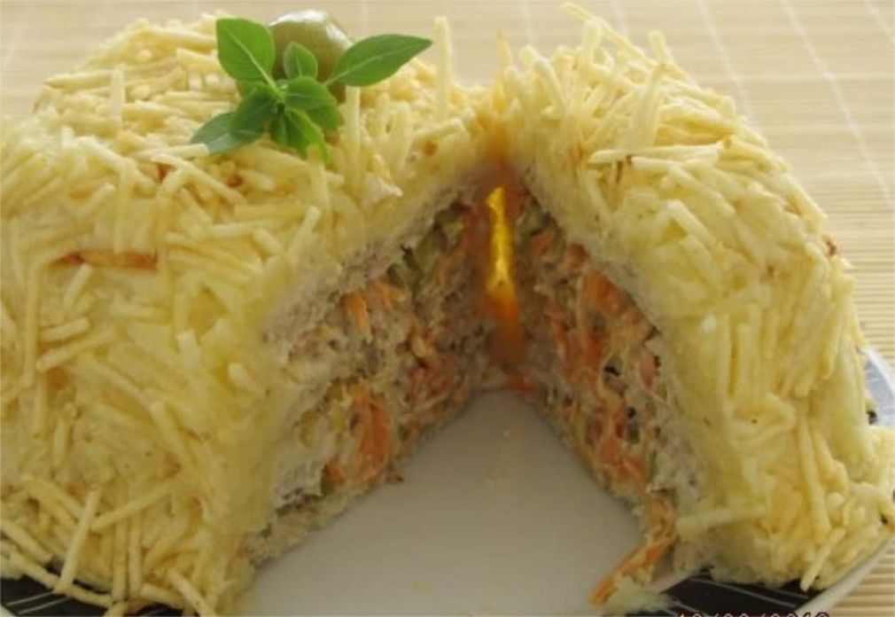 Em uma forma coloque as fatias de pão, coloque um pouco de maionese, acrescente metade do recheio e metade da cenoura ralada. Coloque a segunda camada de pão de forma e repita o processo.