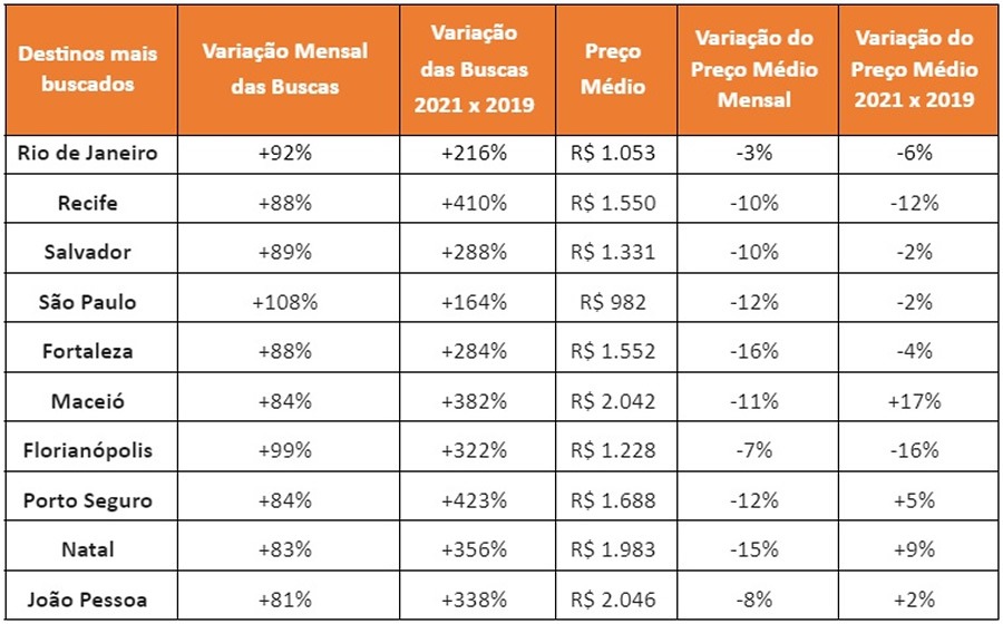 Quanto aos valores dos voos, São Paulo é a cidade que apresentou menor preço médio nas passagens, custando R$ 982, assim como a que teve maior aumento nas buscas em comparação a outubro deste ano (+108%). Rio de Janeiro é o segundo destino mais barato, com voos por R$ 1.053 em média. Em seguida, Florianópolis, que atualmente tem passagens no valor médio de R$ 1.228. A capital catarinense também é a que teve maior decréscimo no preço na comparação entre 2021 vs 2019, custando até 16% a menos do que há dois anos. Enquanto isso, Maceió teve o maior aumento no preço médio das passagens comparando 2021 vs 2019, com +17%.