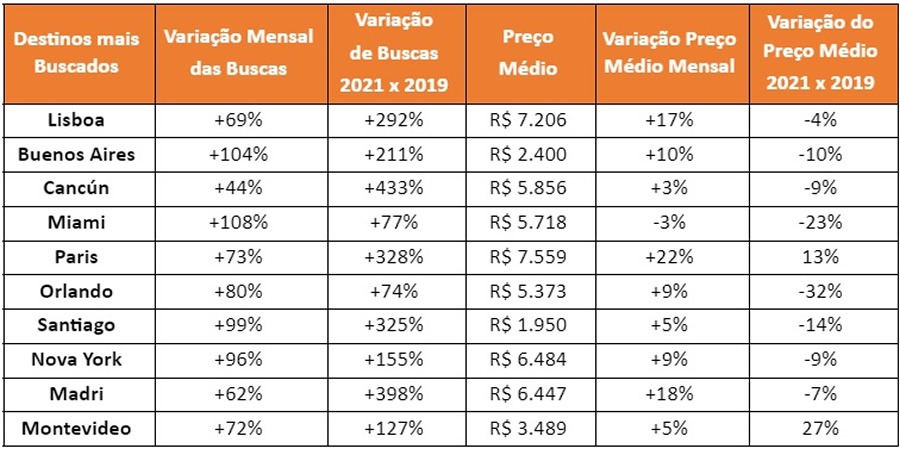 Já na lista de destinos internacionais, Lisboa é a cidade que está em primeiro nas buscas para o período de Réveillon, seguida de Buenos Aires. Em ambas, o preço médio subiu na comparação mensal, mas caiu em relação ao mesmo período de 2019.