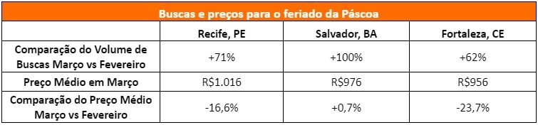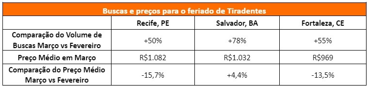Em março, o preço médio das passagens aéreas para Recife e Fortaleza apresentam queda de até 23,7% para viagens em ambos os feriados, quando comparados com fevereiro. Salvador, apesar do aumento no preço médio, não teve grande variação nos valores dos bilhetes, com crescimento de 0,7% para viagens na Páscoa e 4,4% em Tiradentes.