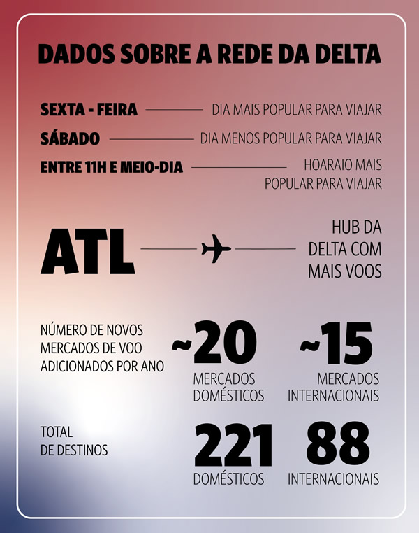 Mais de 90 mil funcionários da Delta lideram o caminho para oferecer uma experiência de alto nível ao cliente em mais de 4 mil voos diários para mais de 275 destinos em seis continentes, conectando pessoas a lugares e entre si.