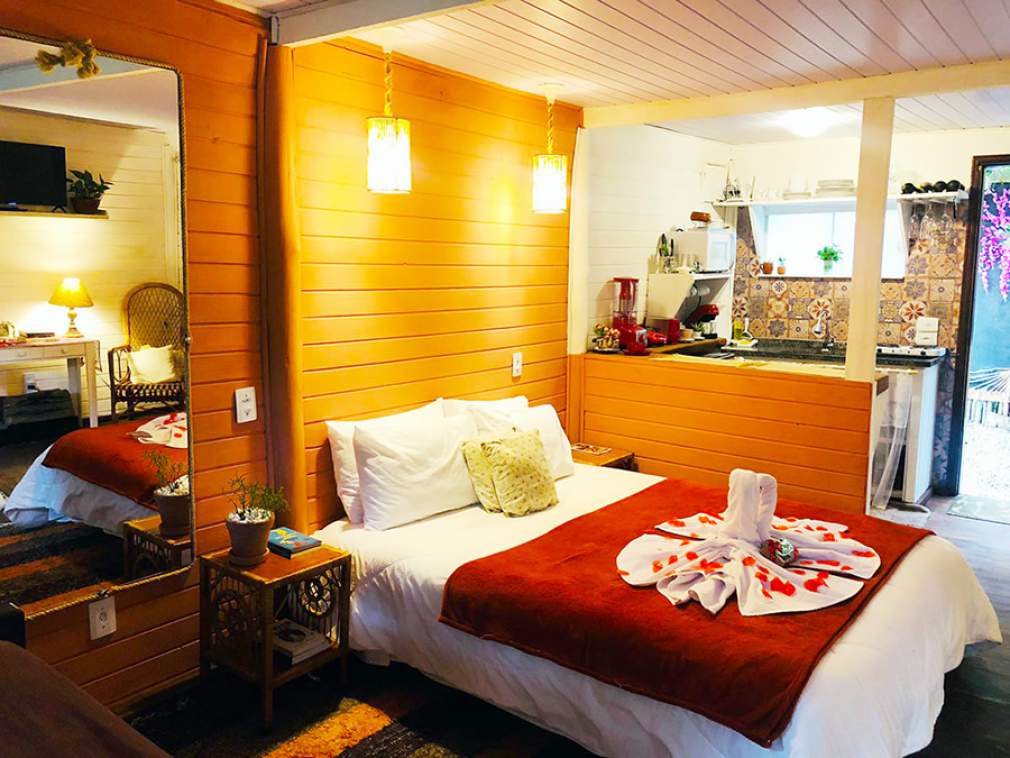 O lugar é tão acolhedor que é difícil criar coragem para sair do espaço em busca de restaurantes para almoçar ou jantar. Mas a casa pensou na comodidade dos hóspedes e mantém cozinha equipada com utensílios, panelas, frigobar, micro-ondas, liquidificador, sanduicheira, torradeira, taças, talheres e peças para a produção de fondue. Tudo para curtir este lugar incrível por mais tempo.