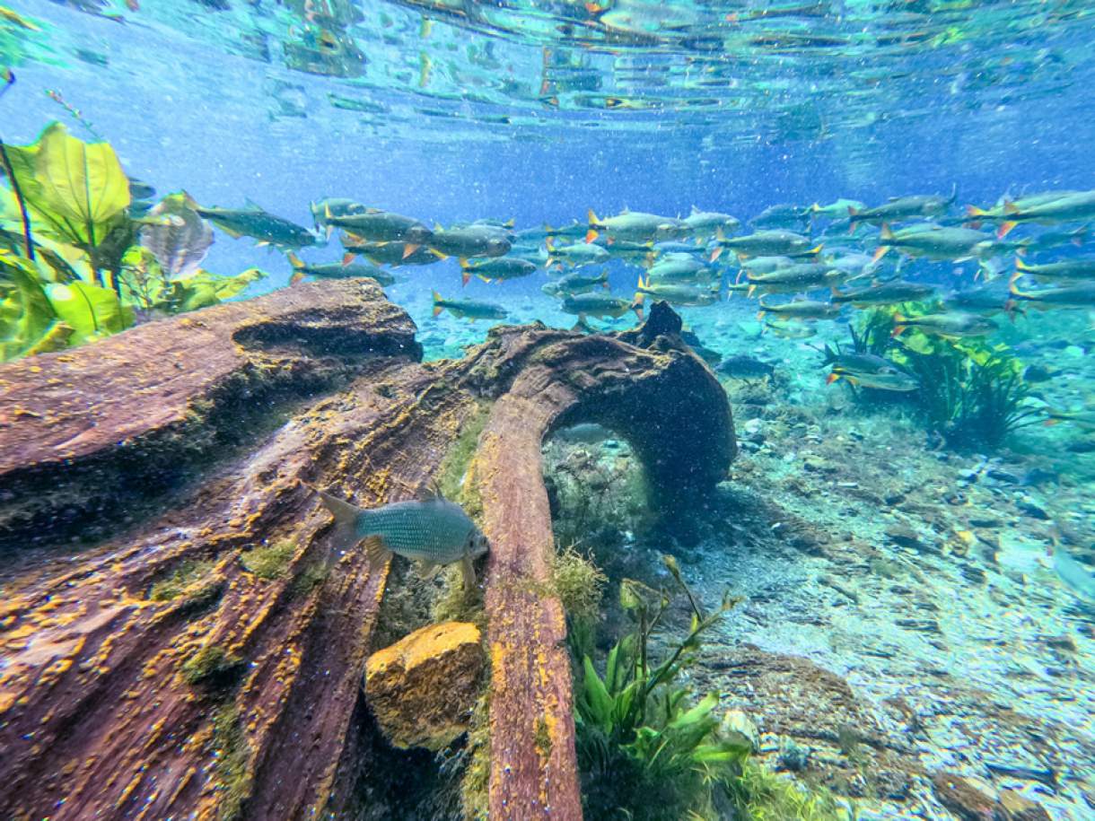 Complexo de ecoturismo, a Nascente Azul oferece uma profunda e singular conexão com a natureza em diversas atividades. A mais famosa é a flutuação, que começa sobre a própria nascente, onde a água apresenta a rara tonalidade de um azul intenso. Mas é ao entrar ali que você percebe como ela é cristalina, com um grau de visibilidade que supera os 40 metros na horizontal. Na sequência, você segue em uma flutuação tranquila pelo rio, em meio a peixes de diversas espécies e um colorido jardim subaquático.
