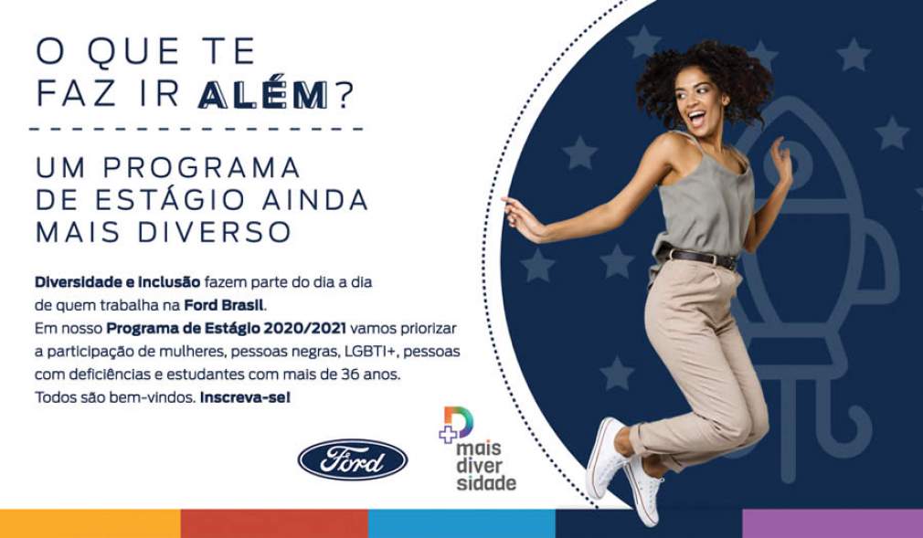 A diversidade e inclusão é um tema cada vez mais presente na Ford Brasil e ganha relevância com o lançamento do seu Programa de Estágio 2020/2021, que vai priorizar candidaturas de pessoas negras, LGBTI+, mulheres, pessoas com deficiência e estudantes com mais de 36 anos para aumentar a representatividade na empresa.