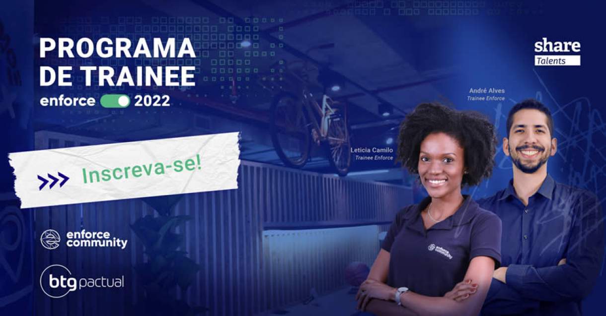 O Programa de Trainee da Enforce está com inscrições abertas até o dia 7 de agosto. Conduzido pela Share People Hub, o processo de seleção terá etapas online e presenciais. As inscrições estão disponíveis pelo site https://talents.sharerh.com/programa-de-trainee-enforce-2022-programa?utm_source=assessoria&utm_medium=assessoria&utm_campaign=assessoria