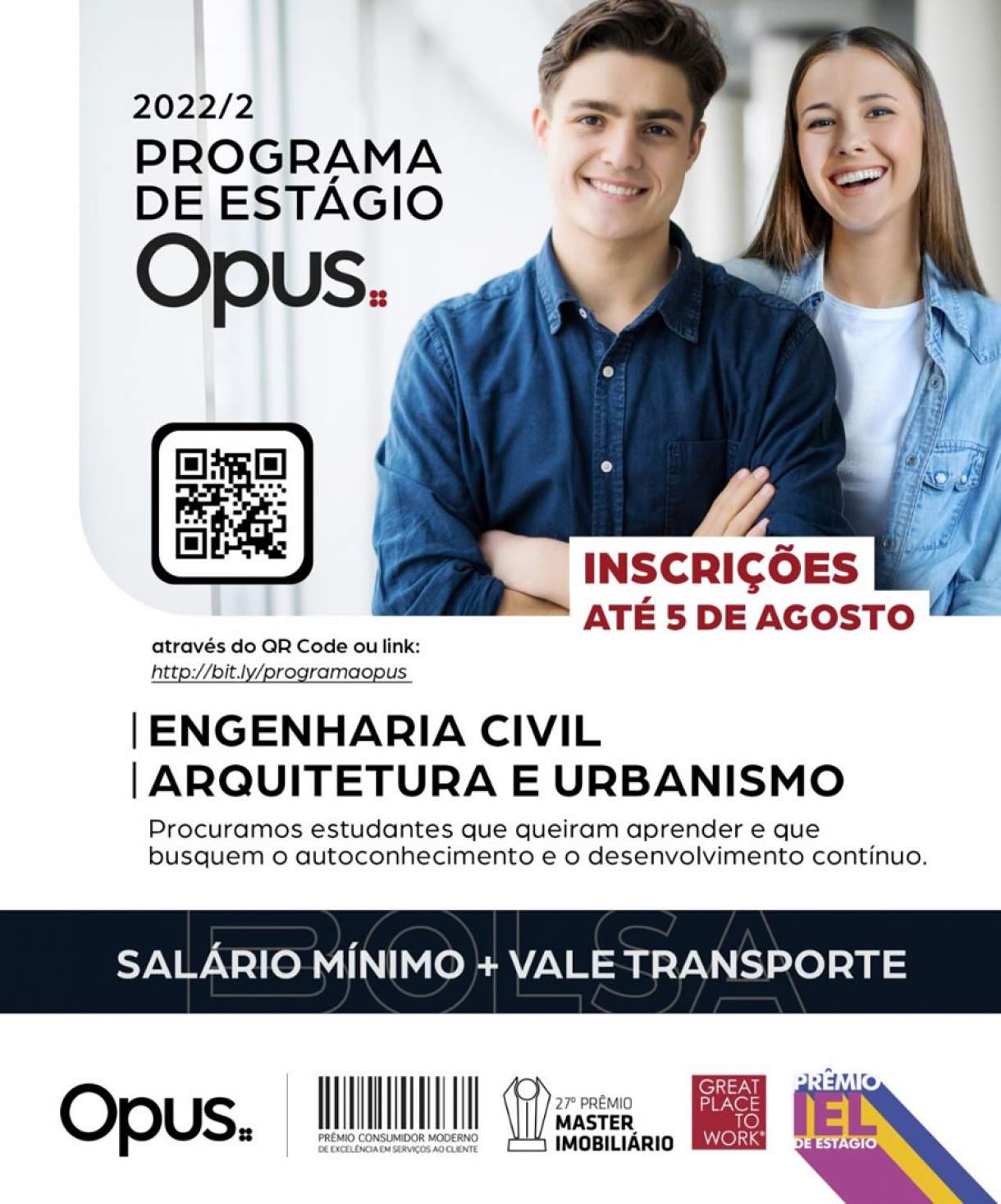 O bom momento do mercado da construção civil ainda favorece os estudantes de cursos que tenham ligação com a área. A Opus também abriu seleção para o seu premiado programa de estágio. São ofertadas 10 vagas para estudantes de Engenharia Civil e Arquitetura e Urbanismo. Não há limitação de período cursado. A empresa oferece vale-transporte, bolsa-auxílio no valor de um salário mínimo, flexibilidade de horário e capacitação interna, além da possibilidade de contratação no final do estágio.