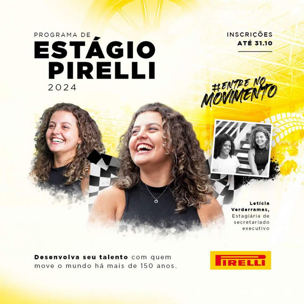 Dentre os quase 100 anos de presença da Pirelli no Brasil, mais de 40 contaram com edições do Programa de Estágio. Milhares de profissionais foram formados, no que já se tornou uma tradição da atuação da empresa no país. Agora, a Pirelli abre as inscrições para o Programa de Estágio 2024.1, que irão de 5 a 31 de outubro deste ano. Portanto, #EntreNoMovimento e corra para fazer sua inscrição.