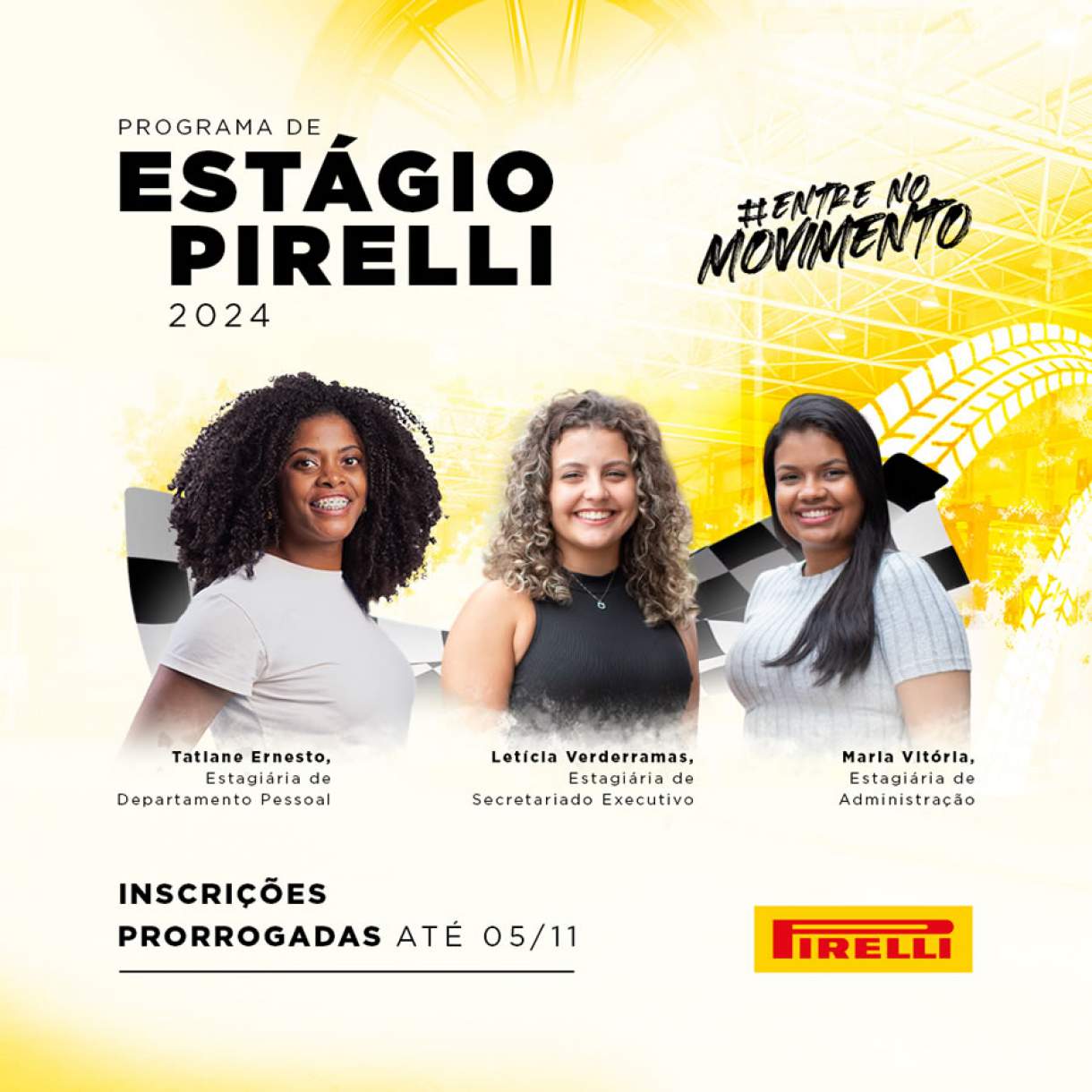 Dentre os quase 100 anos de presença da Pirelli no Brasil, mais de 40 contaram com edições do Programa de Estágio. Milhares de profissionais foram formados, no que já se tornou uma tradição da atuação da empresa no país, e o prazo de inscrições para o Programa de Estágio 2024.1, que terminaria neste dia 31 de outubro, foi prorrogado até o dia 5 de novembro. Portanto, #EntreNoMovimento e corra para fazer sua inscrição.