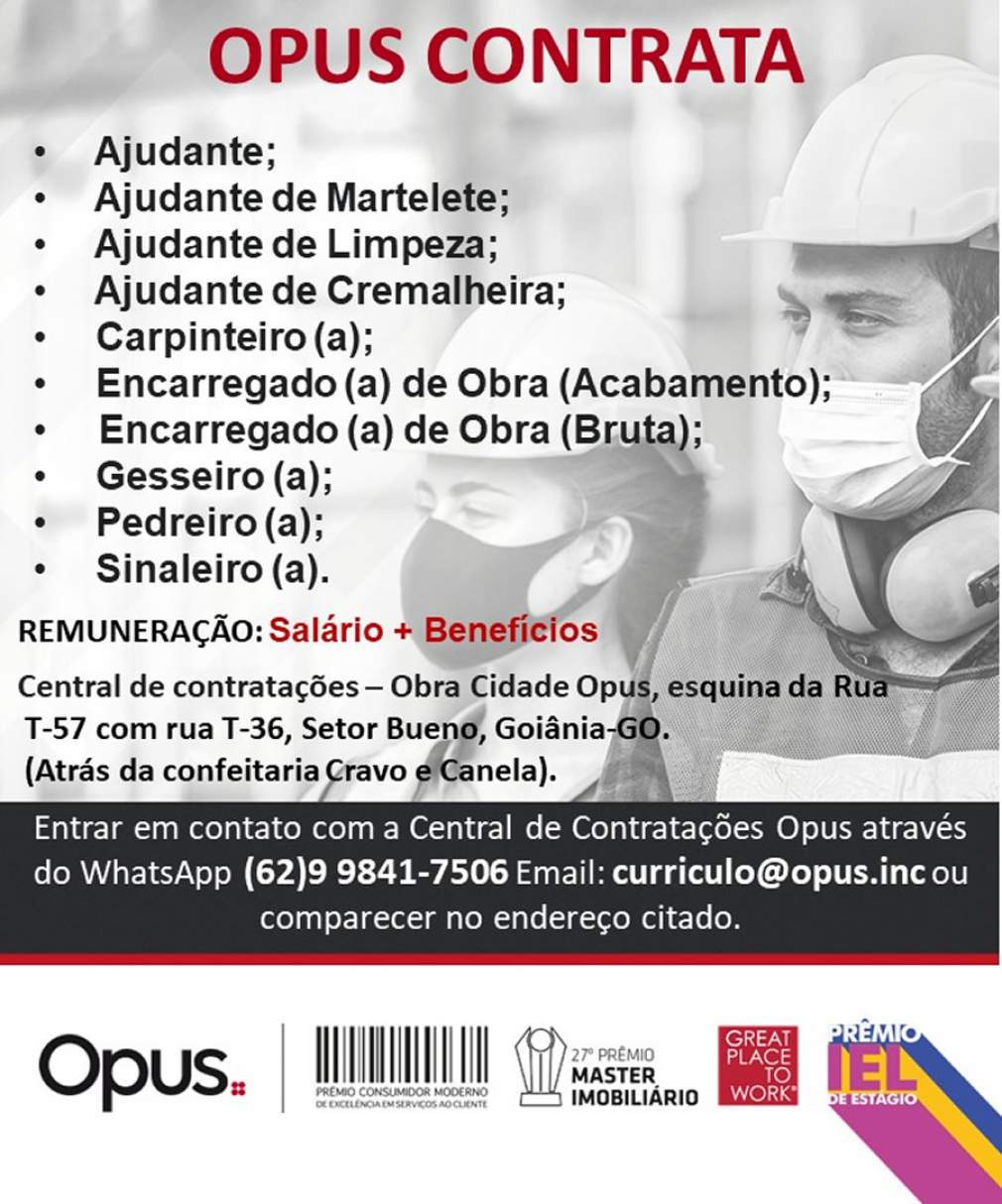 Em 2024 o setor tem tudo para se manter como um grande gerador de postos de trabalho oficiais. Em Goiânia, a Opus Incorporadora possui 16 obras em andamento atualmente e sempre disponibiliza oportunidades de emprego com carteira assinada. No momento, a empresa está com 58 vagas abertas para os seguintes cargos: